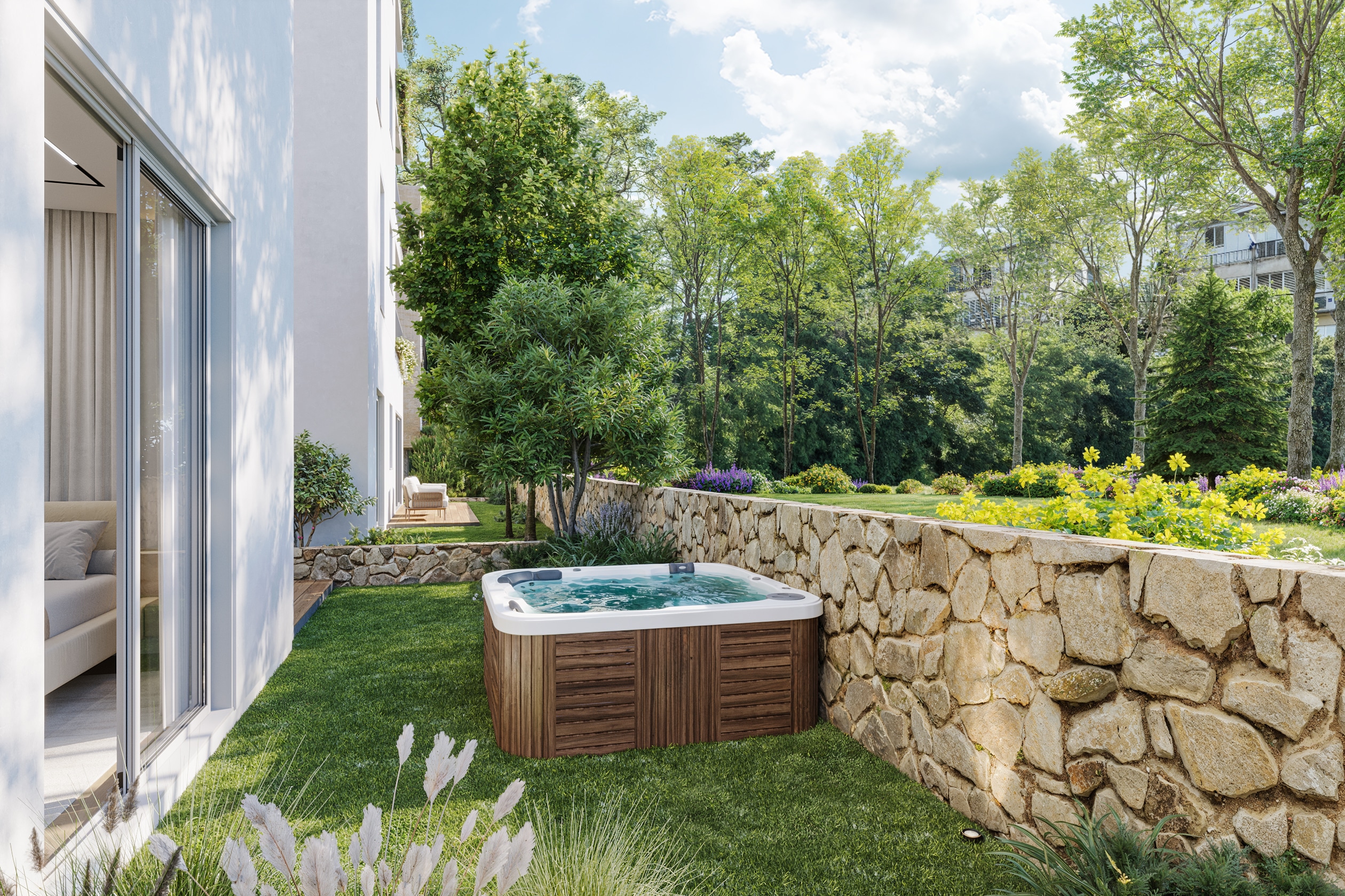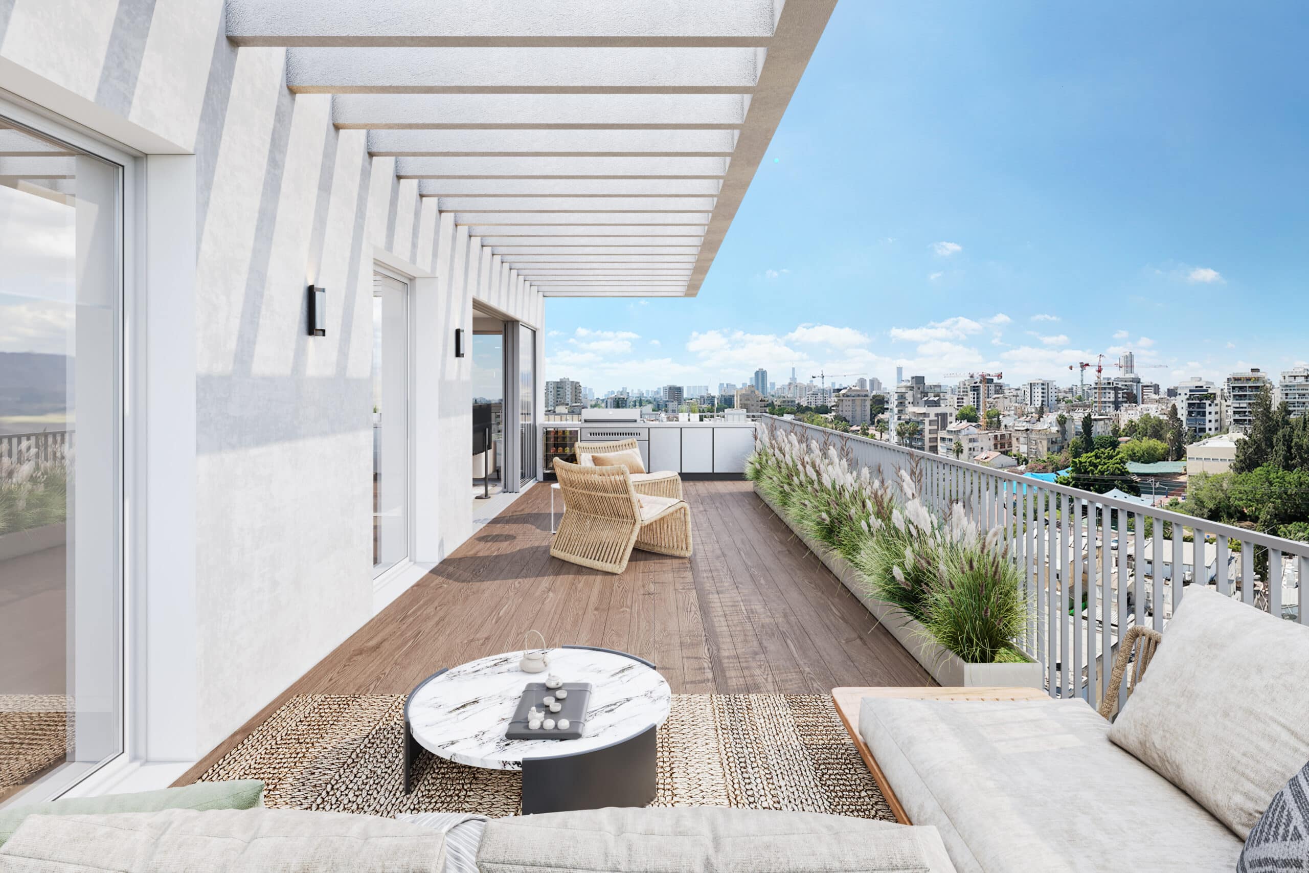 מרפסת שמש – ברז מים > נקודת גז > ריצוף גרניט פורצלן במבחר דגמים, כולל דמוי דק > מטבח חוץ מבית אחת החברות המובילות “Carmel-Direct” או ש״ע (שווה ערך) > הכנה לג׳קוזי.