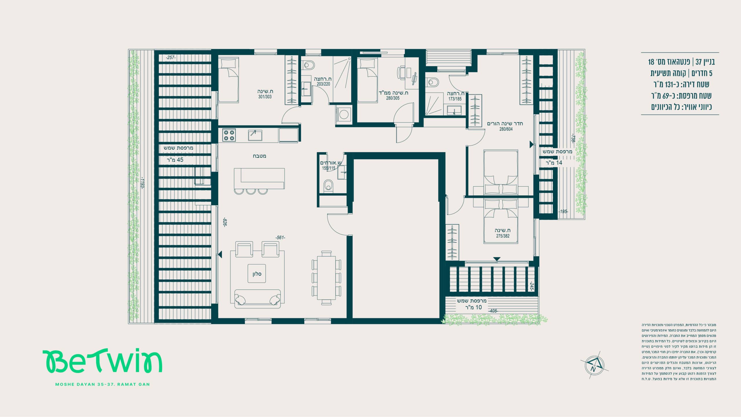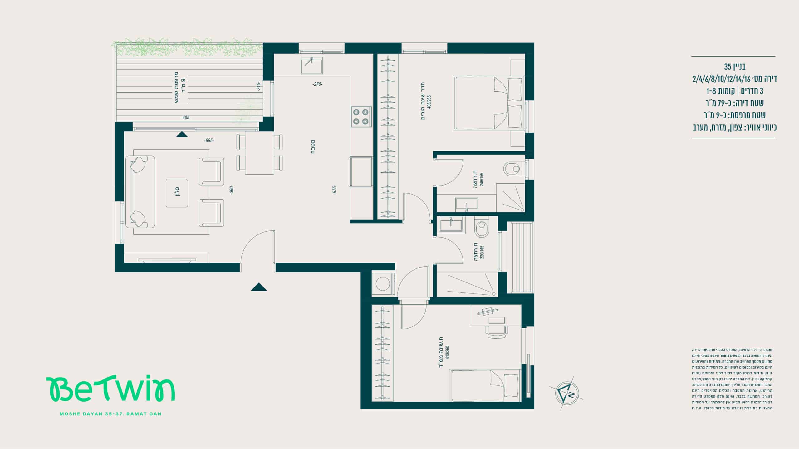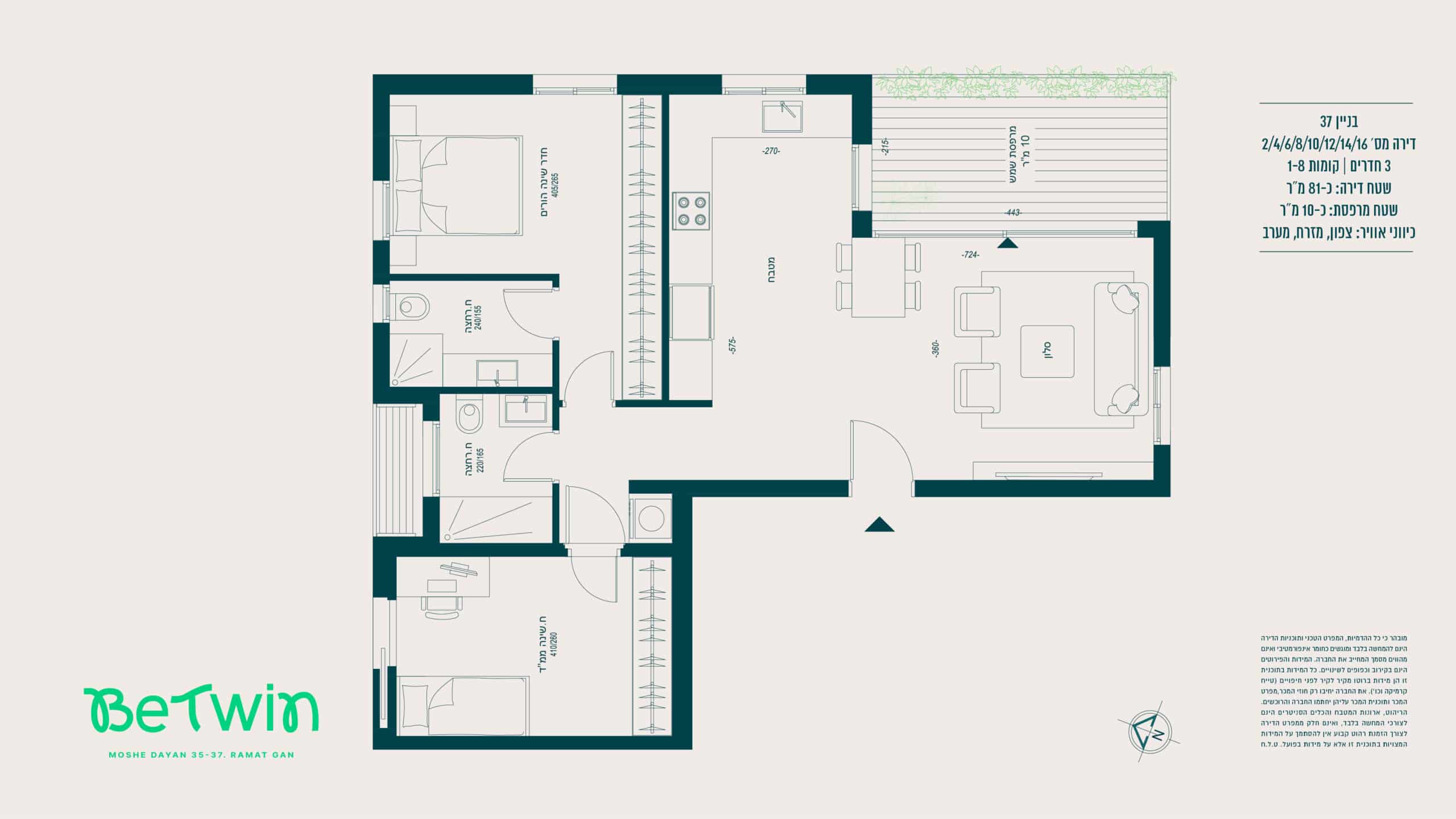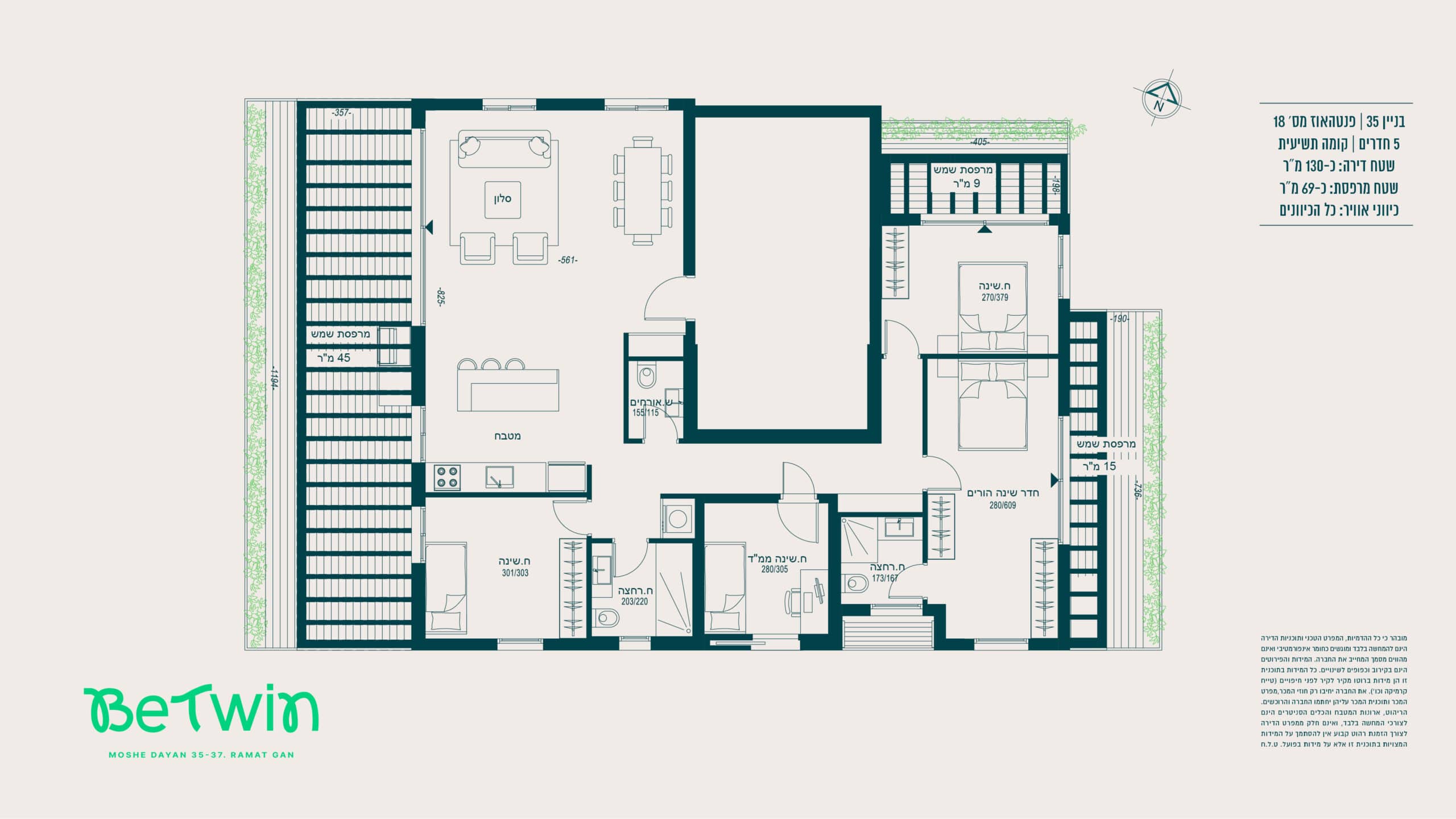הדירה – מערכת מיזוג אוויר מיני־מרכזי מסוג “אינוורטר” (למעט בחדרי רחצה) של אחת מהחברות המובילות > רשתות בכל חלונות הדירה (למעט חדרי רחצה וממ״ד) > תריסי גלילה חשמליים בכל החדרים (למעט חדרי רחצה וממ״ד) > ריצוף גרניט פורצלן במידות 80×80 או 100×100 (למעט חדרי רחצה והמרפסות), במגוון צבעים לבחירה — סטודיו קרמיקה או ש״ע (שווה ערך) > ריצוף חדרים רטובים עם מרצפות אנטי־סליפ במידות 30×30 > דלת ביטחון מעוצבת — רב־בריח או ש״ע (שווה ערך) > דלתות פנים — פנדור או ש״ע (שווה ערך) > דלת עץ בממ״ד (בנוסף לדלת הברזל) > מערכת חימום מים סולארית וגז > אלומיניום איכותי תוצרת “קליל” או ש״ע (שווה ערך).
