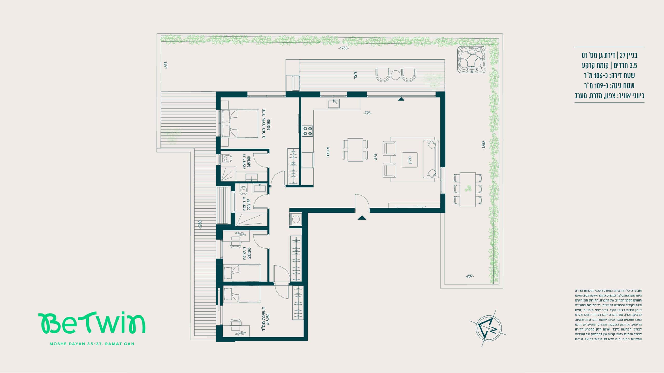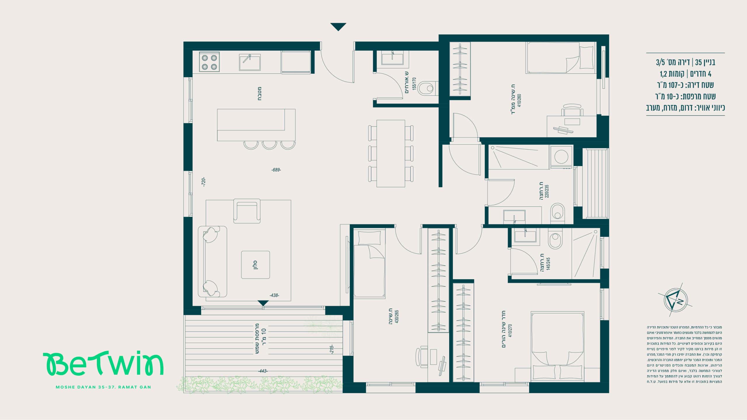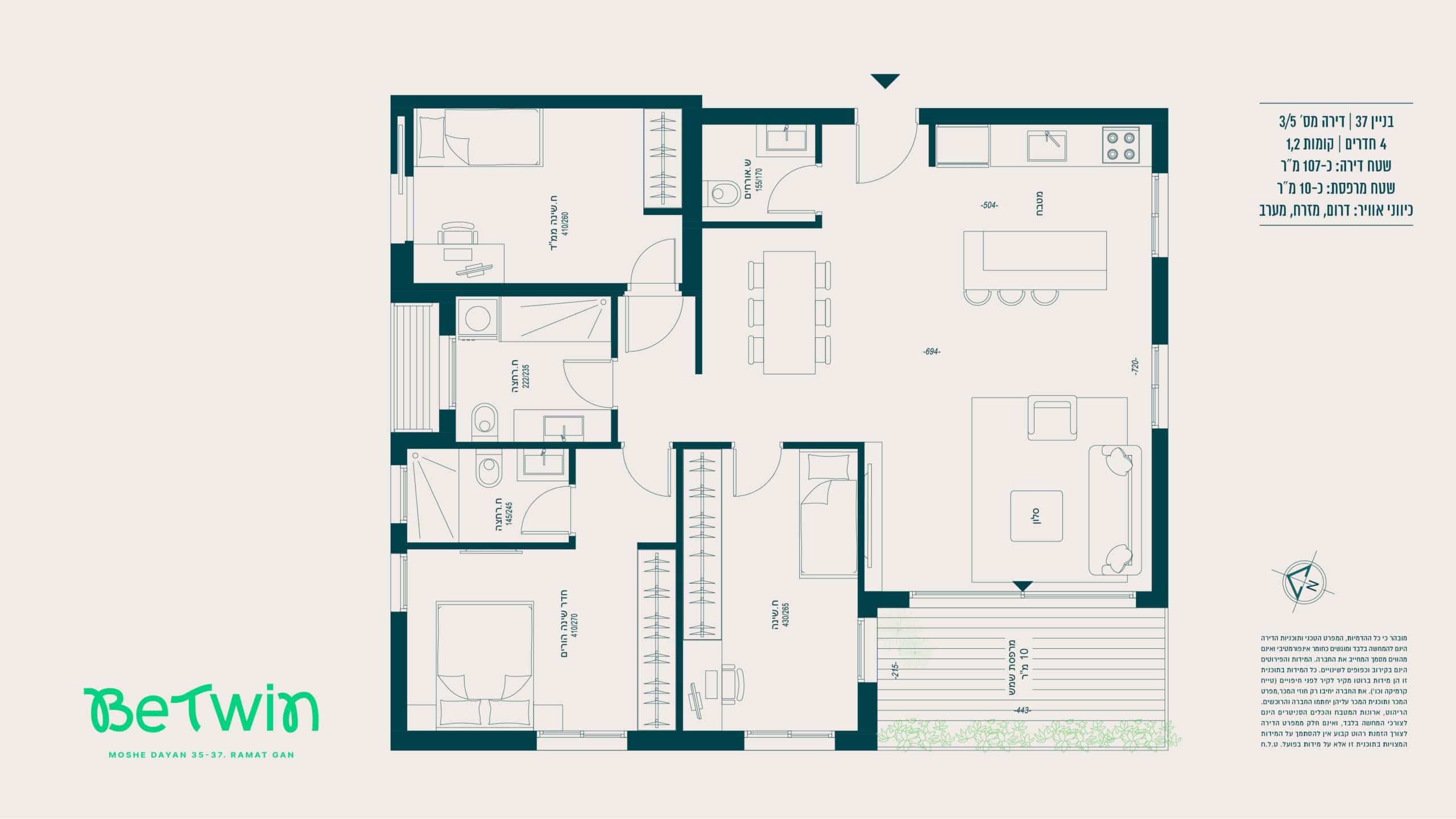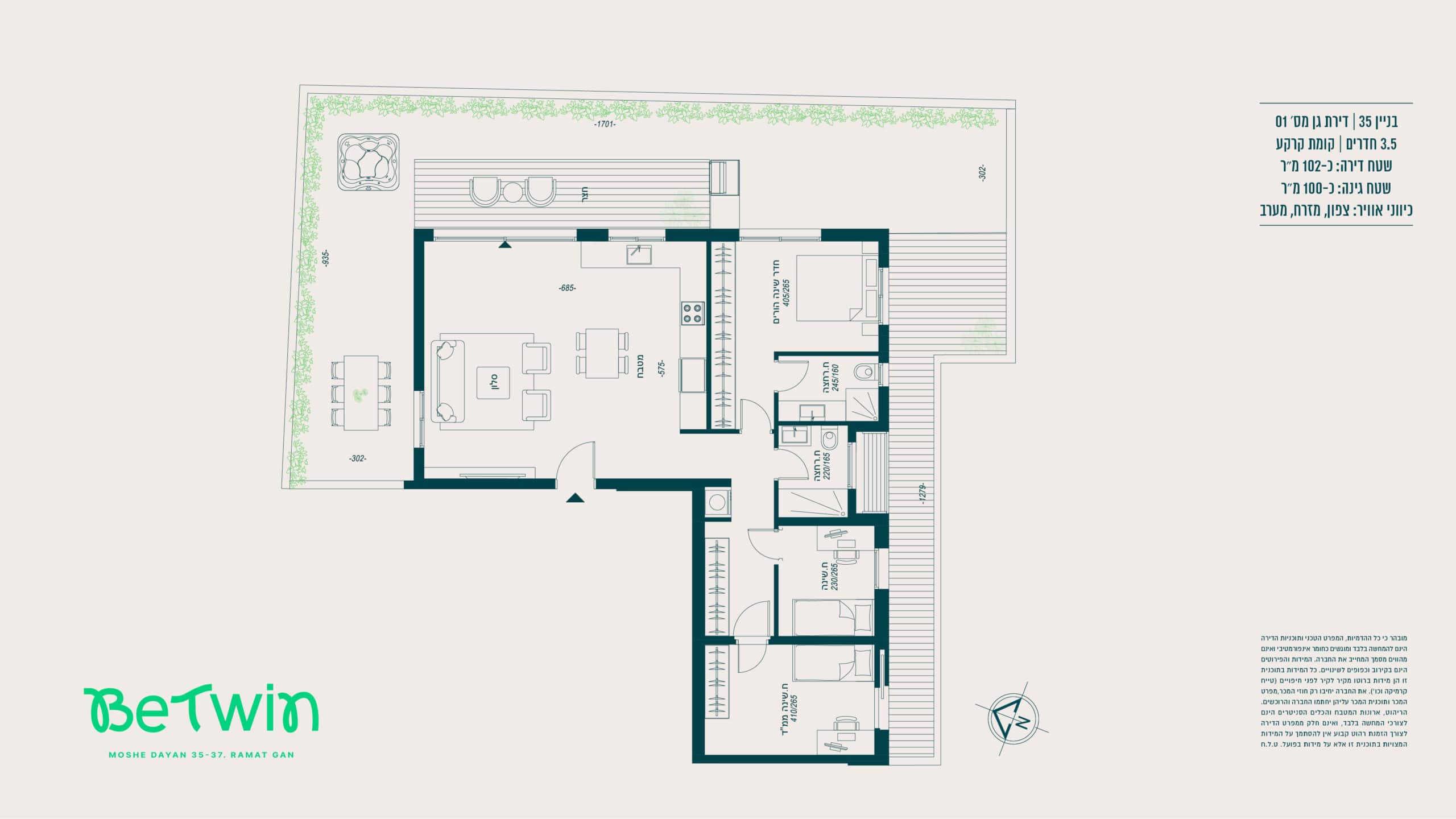 הדירה – מערכת מיזוג אוויר מיני־מרכזי מסוג “אינוורטר” (למעט בחדרי רחצה) של אחת מהחברות המובילות > רשתות בכל חלונות הדירה (למעט חדרי רחצה וממ״ד) > תריסי גלילה חשמליים בכל החדרים (למעט חדרי רחצה וממ״ד) > ריצוף גרניט פורצלן במידות 80×80 או 100×100 (למעט חדרי רחצה והמרפסות), במגוון צבעים לבחירה — סטודיו קרמיקה או ש״ע (שווה ערך) > ריצוף חדרים רטובים עם מרצפות אנטי־סליפ במידות 30×30 > דלת ביטחון מעוצבת — רב־בריח או ש״ע (שווה ערך) > דלתות פנים — פנדור או ש״ע (שווה ערך) > דלת עץ בממ״ד (בנוסף לדלת הברזל) > מערכת חימום מים סולארית וגז > אלומיניום איכותי תוצרת “קליל” או ש״ע (שווה ערך).